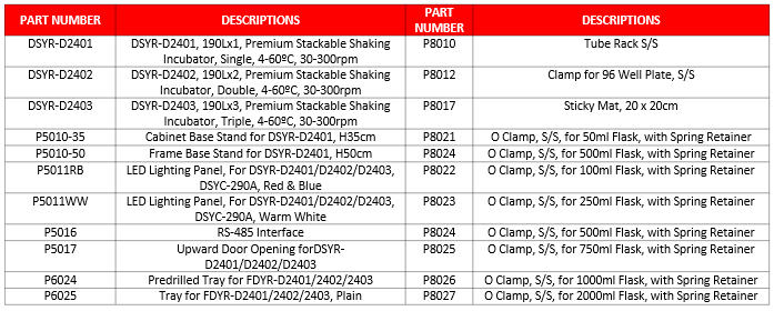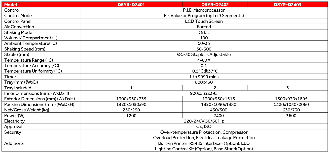 3.Wide-view fold-down door with door handle, and ergonomic sliding-out shaking platform provide convenient access to your experiment products. Fold-up door option (#P5017) available for DSYR-D2403 for easy loading on the top unit.
