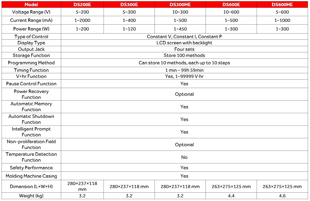 DS-E series universal power supply comprise 10 models, including: DS200E, DS300E, DS300HE, DS600E, 600HE, DSl000E, DSl600E, DS3000E, DS5000E , DSl0000E, the maximum output voltage varies from 200V to 10000V, can widely cover most electrophoresis experiments, darsun can provide different types of power supplies for experiments with different uses.