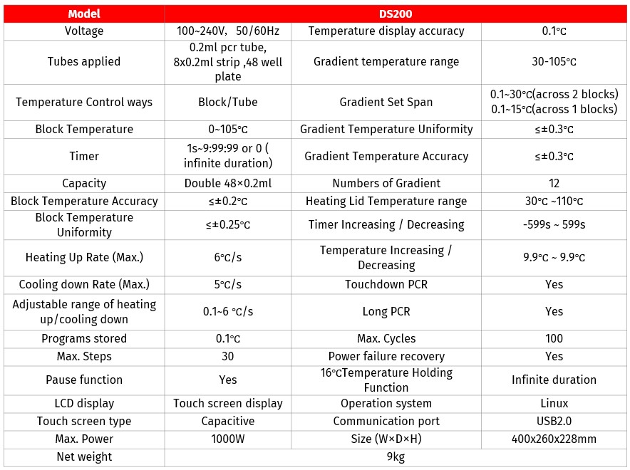 DS200 is a qualitative thermal cycler with dual blocks which are independent controlled, the advanced peltier technology brings accurate temperature control, and make the cycles reaches up to a million times. It’s an ideal thermal cycler for researches of life sciences in most labs.