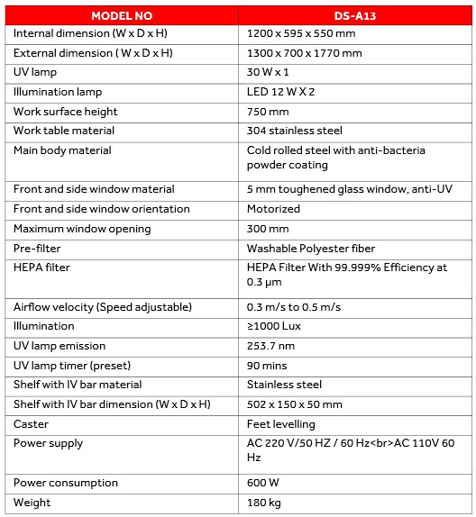 PCR Cabinet DS-A13 features a slide glass window maximizing light and visibility for the workstation. Equipped with a washable pre filter and